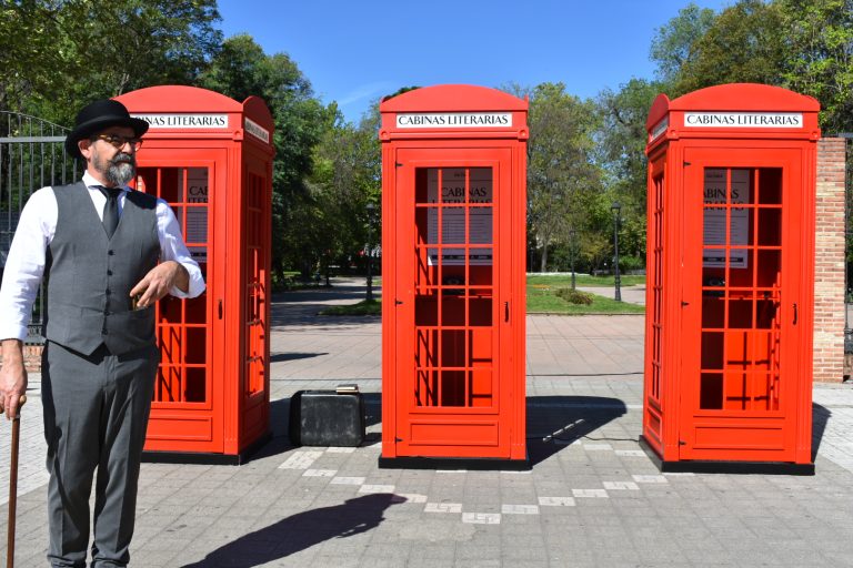 Tres cabinas telefónicas inglesas en las experimentar un viaje, desde la intimidad de un espacio pequeño y aislado, como si las palabras de los poetas y escritores fueran susurradas solo para ti.